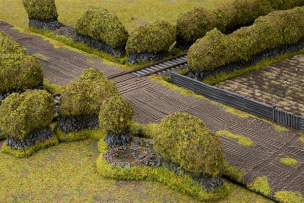 Contains five pieces of flocked, pre-painted Bocage, ready for your Normandy battles. 1x 6"/15cm bombed straight, 1x 4"/10cm bombed straight, 2 different corners and 1x t-section.