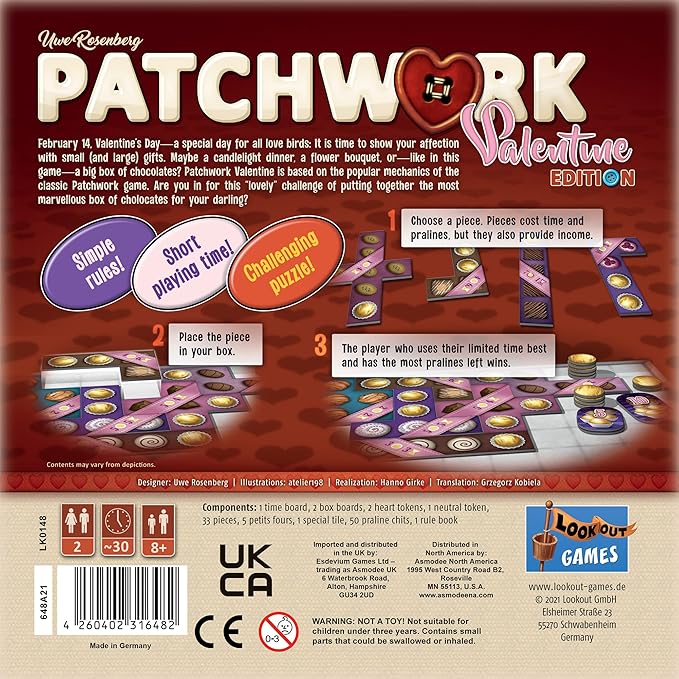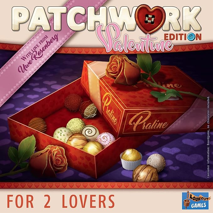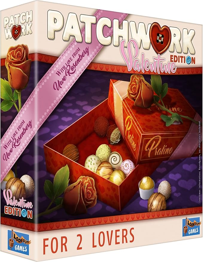 Patchwork: Valentine’s Day Edition is a special holiday version of the classic 2-player puzzle/strategy board game from Lookout Games, featuring Valentine’s-themed artwork and components.