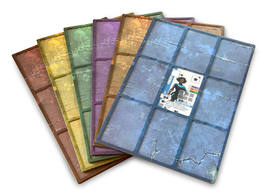 These 6 dual-layered cardboard playmats were designed specifically for Vantage. Each player will create a 3x3 grid of cards as they explore the world; these optional mats prevent cards from shifting. One pack covers the quantities needed for a full 6-player game.